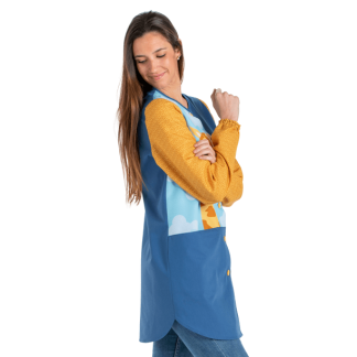 Bata sem mangas texano para professora/educadora com lindo bordado de flores em patchwork nos bolsos para realçar a peça.