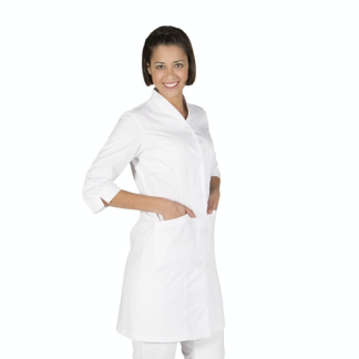 Bata sem mangas feito de microfibra. Modelo ajustado preso com suportes e detalhe de cinto.