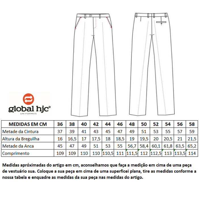 Calça de Homem um bolso de cada lado tipo Francês, sem pinças á frente, Bolso tipo relojoeiro e presilhas na cintura para cinto. Tecido elástico para garantir a liberdade de movimentos.