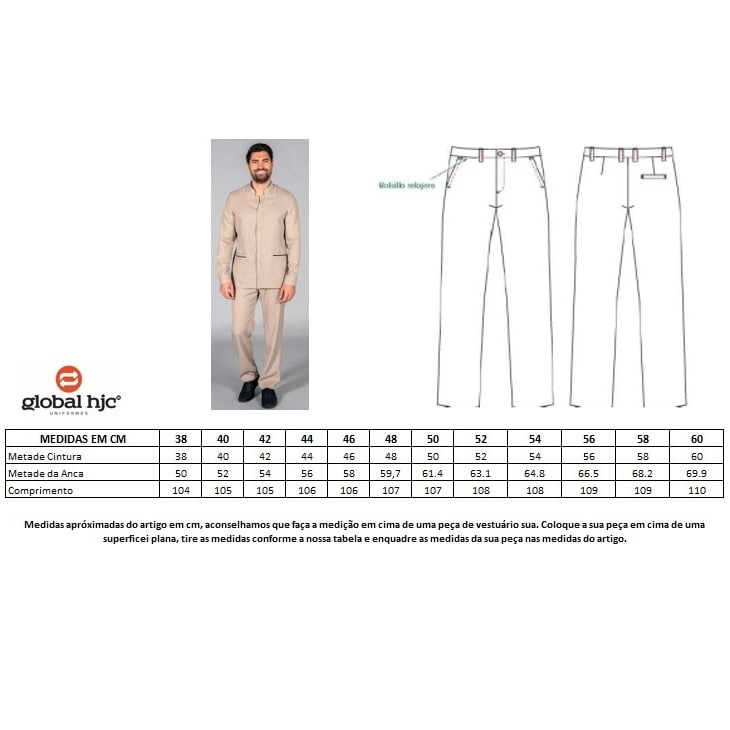 Calças masculinas semi-ajustadas, cintura média. Modelo com dois bolsos na anca, um atrás com casa de botão, um bolso para relógio e sem dardos na frente.