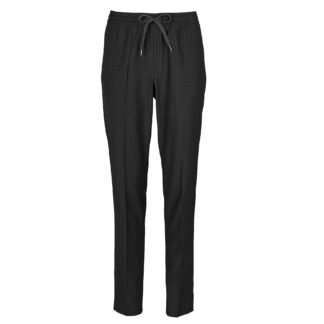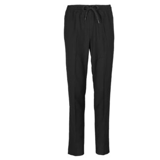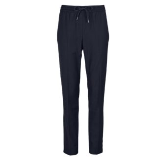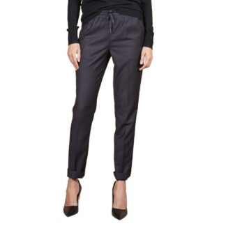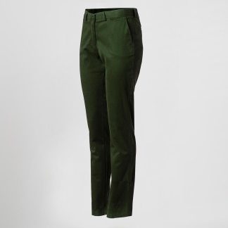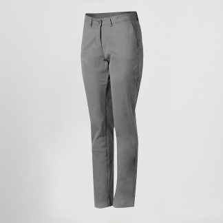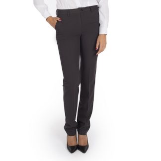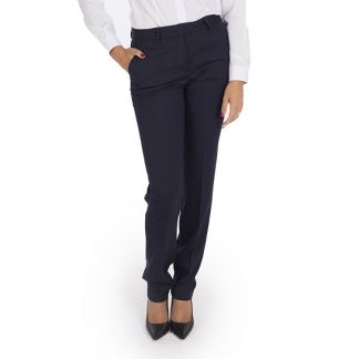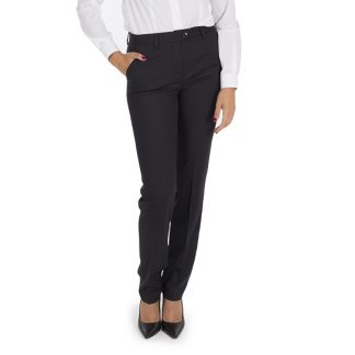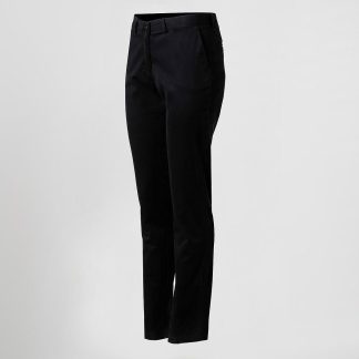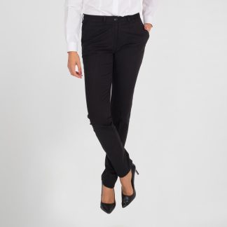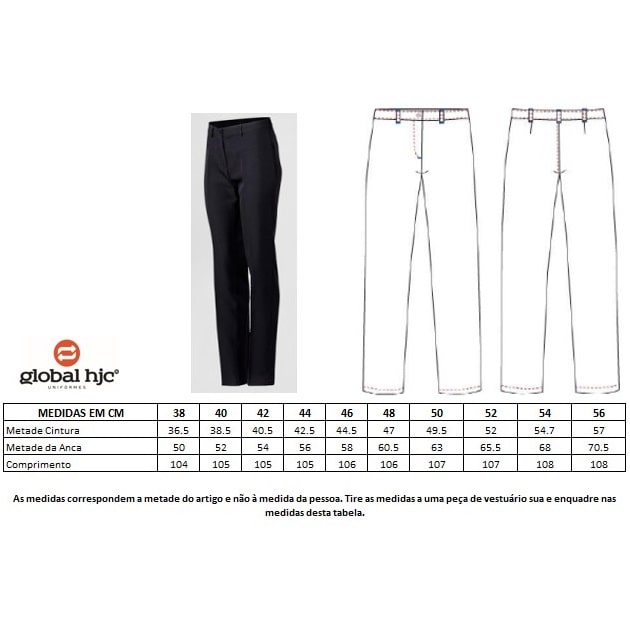 Calça de senhora justa, cintura média. Modelo sem bolsos e sem dardos na frente, possui presilhas na cintura.