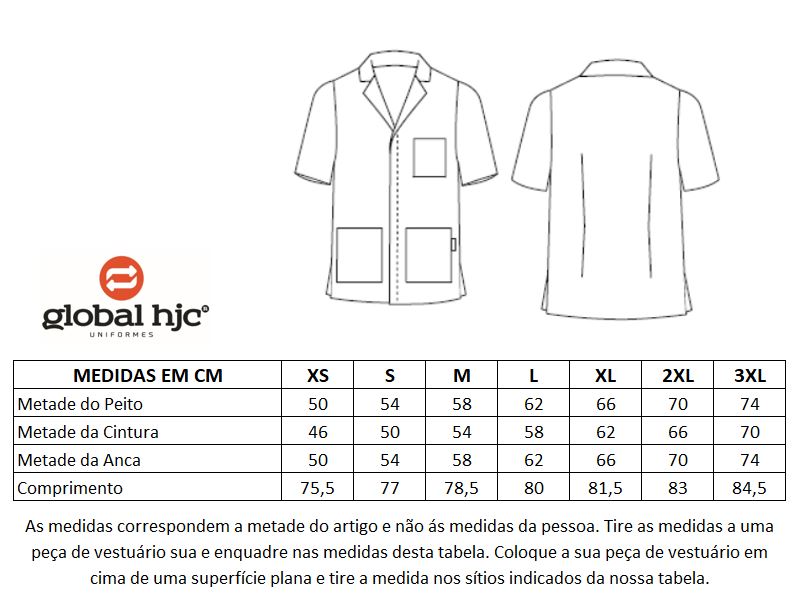 Manga curta, gola de lapela, um bolso no peito esquerdo e dois bolsos frontais.