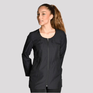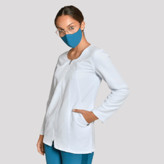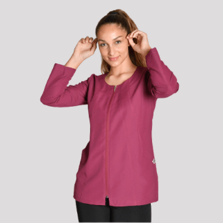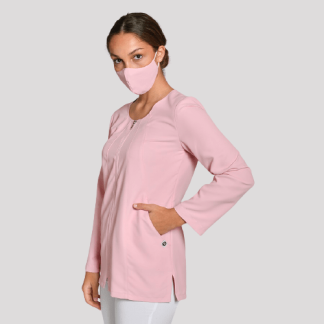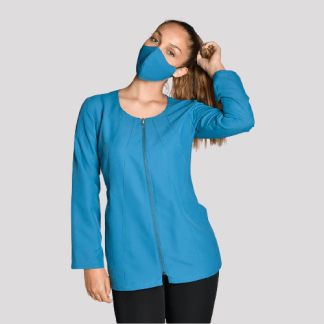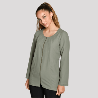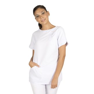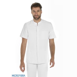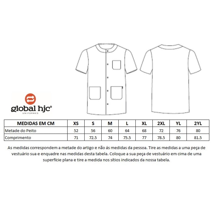 Casaca de manga curta unissexo aberta á frente com botões.