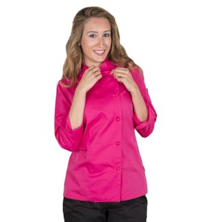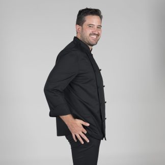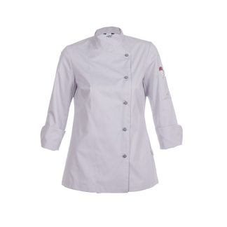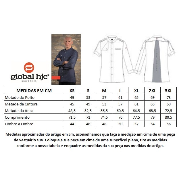 Jaleca unissexo GASTROCHEF com mangas compridas, gola mao, fecho central com botões de pressão visíveis e bolsos no peito e na manga esquerda. Modelo semi-ajustado.