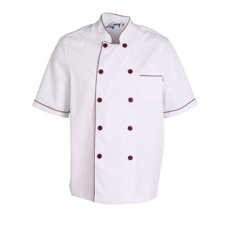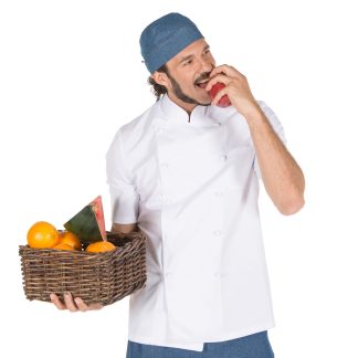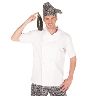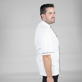 Jaleca unissexo GASTROCHEF de manga curta, com gola mandarim, fecho de correr lateral e bolso na manga esquerda.