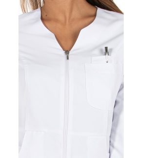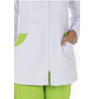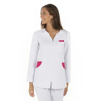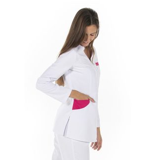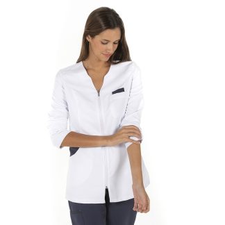 Túnica de senhora maga curta decote em V, aberta à frente com botões brancos, dois bolsos na zona da anca e outro no bolso. Contraste na gola, mangas e bolsos.