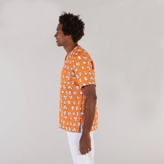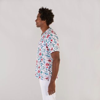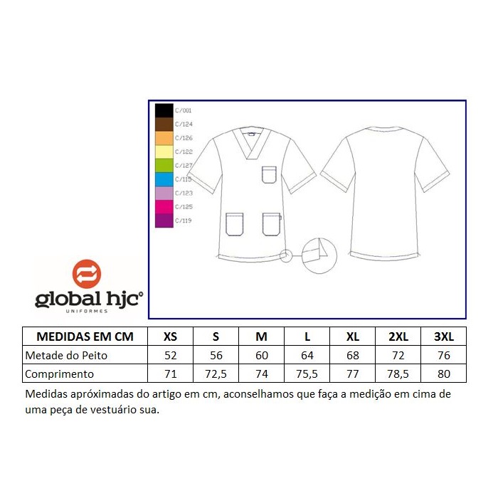Túnica unisexo de manga curta e decote em V. 2 bolsos em baixo e um no peito.