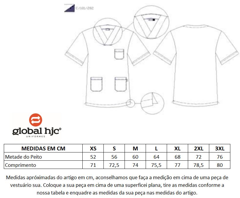 Túnica unisexo de manga curta e decote em V. 2 bolsos em baixo e um no peito.Este modelo é feito em sarja o que proporciona o máximo de conforto e durabilidade, grande resistência á formação de borboto. Tecido suave. Comprimento aproximado 74 cm.