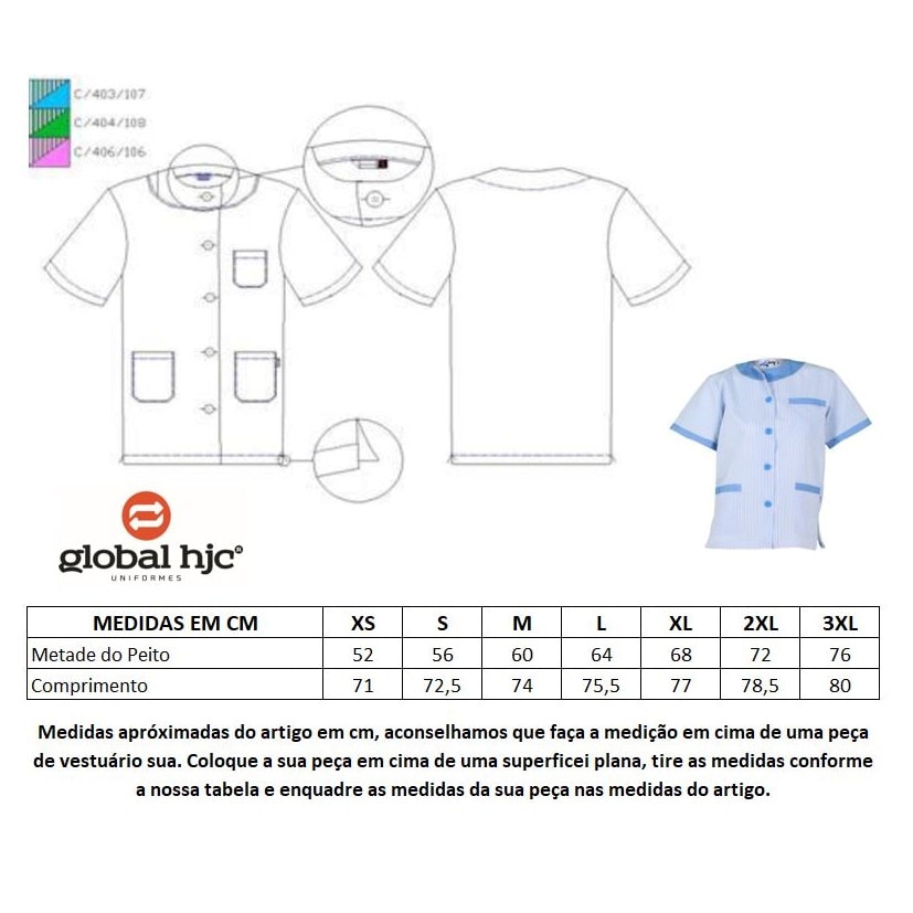 Túnica de senhora maga curta decote redondo, aberta à frente com botões, dois bolsos na zona da anca e outro no bolso. Contraste na gola, mangas e bolsos.